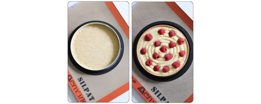 Once your tart shell is par-baked (from Step 1), pipe the almond cream into the bottom and place a few raspberries into the cream.