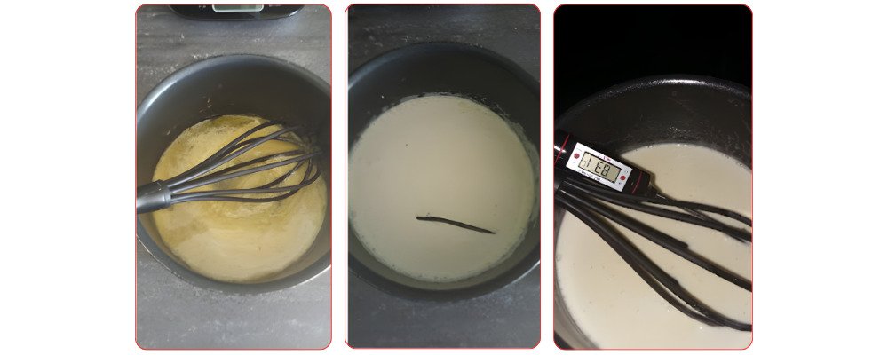 In a saucepan, lightly blanch the eggs and sugar (whisk until pale), add the cream and the scraped vanilla pod.