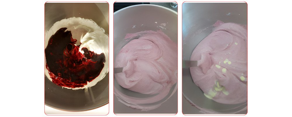 Start by incorporating the blueberry puree little by little into the whipped cream.