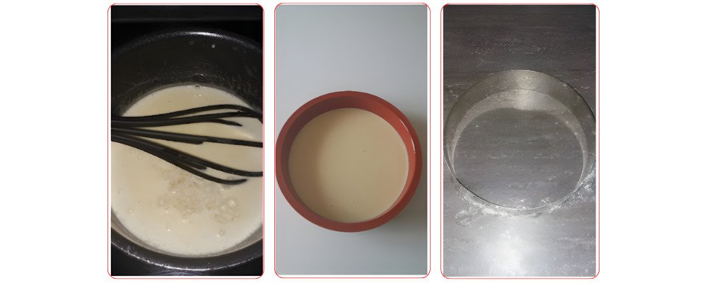 Let cool slightly and pour into an 18 cm mold like mine, or line an 18 cm diameter ring with plastic film and place it on a baking sheet, the plastic film being against the sheet.