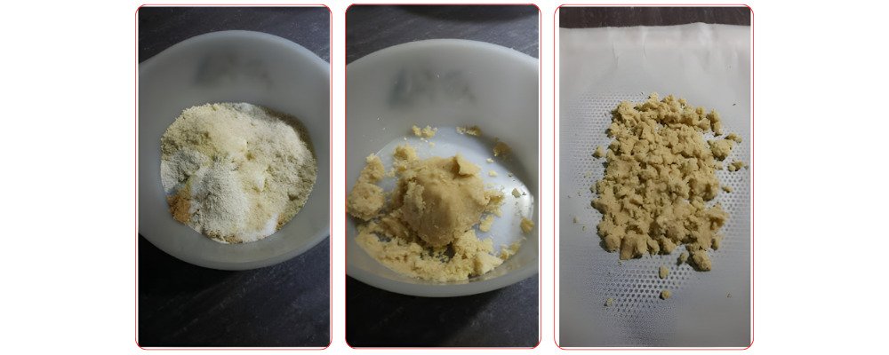 Crumble this ball onto baking paper or a mat and bake for 20 minutes at 150°C fan/convection. Let cool.