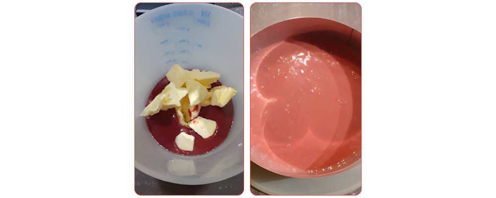 Reheat the glaze, blend, and pour it over the frozen entremet.