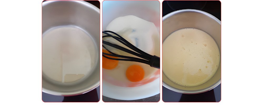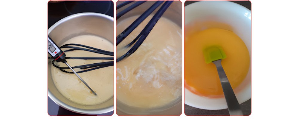 Pour the raspberry puree into a saucepan and heat it to 40°C. In parallel, mix the yolks with the sugar.