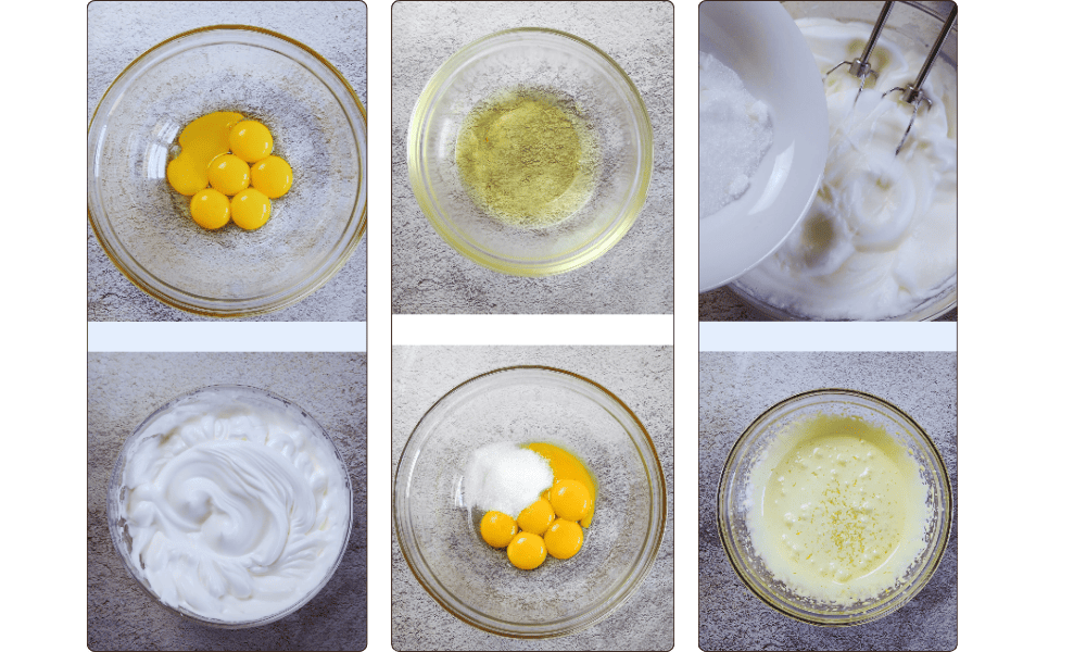 1. Separate the Eggs: Separate the yolks from the whites. Whip the egg whites until stiff peaks form. Add 80 g of the sugar (taken from the total amount) and continue whipping until you obtain a glossy, swollen meringue. Set aside.