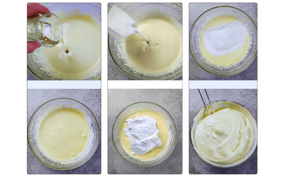 1. Add the lemon zest, the oil (poured slowly in a thin stream), and the milk to the yolk mixture.