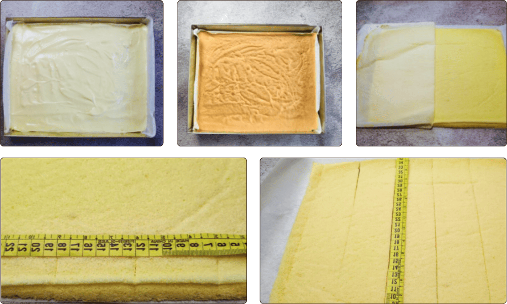 4. Cutting: Peel off the parchment paper from the bottom (now the top). Using a ruler for precision, cut the sponge into strips 6 cm wide.