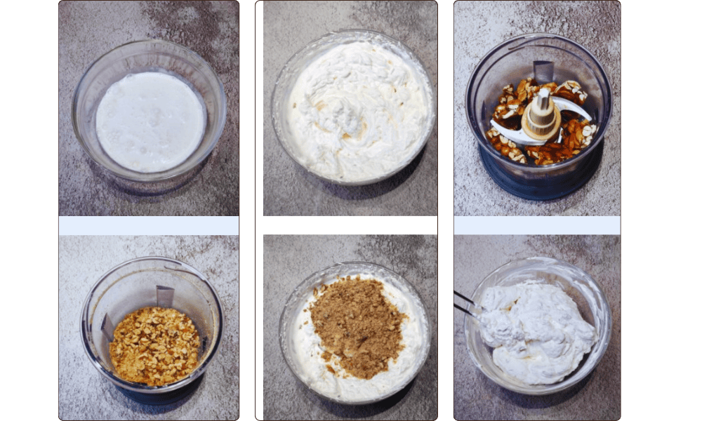2. In a mixer, coarsely chop the peanut brittle (you can also use almond or hazelnut brittle). Add the crushed brittle to the whipped cream and fold it in with a spatula.