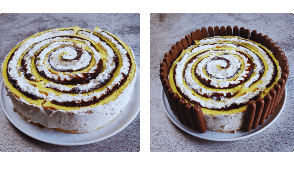 The defining characteristic of this cake lies in its unique architectural composition. Unlike traditional cakes where layers are stacked horizontally, this cake is built vertically using a spiral technique. It requires a little attention to detail but not much physical effort. The base is a simple Pasta Biscotto (Biscuit Sponge)โ€”the same flexible sponge used for Swiss rollsโ€”which is baked flat, then cut into strips of equal height. These strips are slathered with fillings and rolled one after another to form a giant, expanding spiral.