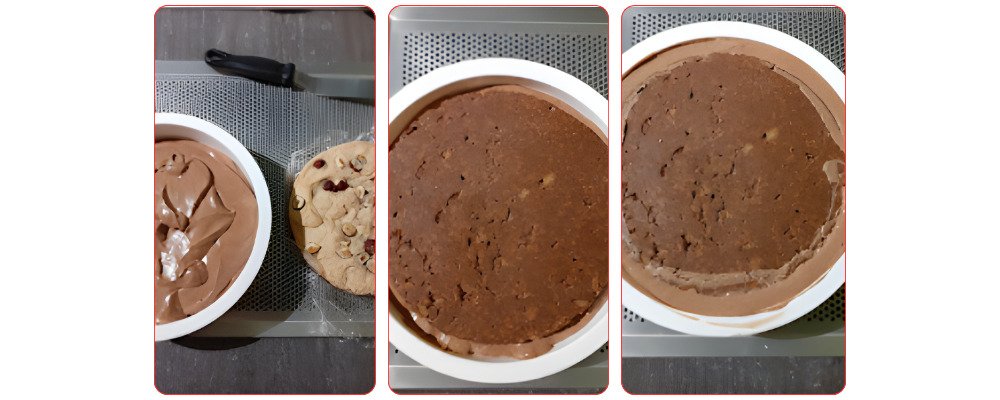 Place it on the crunchy layer. The goal here is that it is on top of the crunchy layer so as not to damage it when cutting the entremet… Film the whole thing and place it in the freezer while making the mousse.
